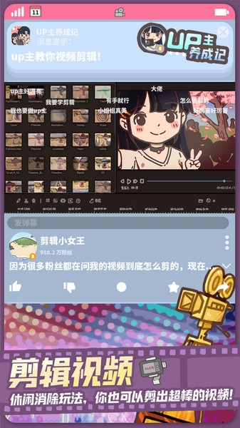 UP主养成记是一款二次元画风的模拟养成游戏。在这款游戏中玩家将以新人UP主的身份在网站上开始活动,设计影片主题,拍摄素材并剪辑然后发布在网站上,想办法吸引更多的人观看视频和关注自己。游戏对粉丝数和播放量都有设置阶段目标,根据每期视频的成绩来为视频打分。当玩家粉丝数达到一定量后还有机会签约MCN机构。