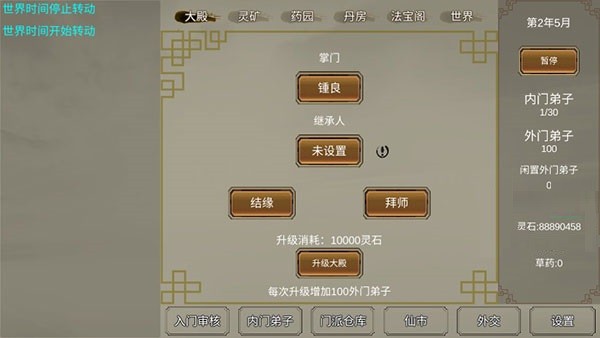尽量保证炼丹能一个回合就能炼一次丹(记得调整外门弟子数量以免造成浪费)前期有300人后尽量保证2回合炼一次。