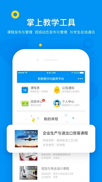 2、实现随时随地教学,轻轻松松教学的理念,安排自己的课程,当天当前课程第一时间通知你再也不用担心忘记授课了,班级学生的动态第一时间知晓。