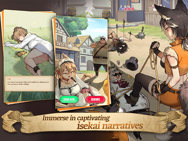 与来自各行各业的同伴建立联系:猫耳女仆,妖精商人,怪物猎人......每个同伴都有自己独特的技能,随时准备帮助您探索 ISEKAI 的秘密并建立自己的村庄。