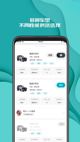 软件亮点很多,支持前后双视频和音频播放,还有电池电压提醒。你可以选不同景区线路和车型,根据使用时间和车辆扣费,透明又合理。而且操作很简单,通过手机就能控制方向、油门、高低速切换等功能,甚至还能用语音控制!软件还支持超视距网络远程遥控,在4G/5G信号覆盖的地方都能用,画面高清,体验感超级棒。