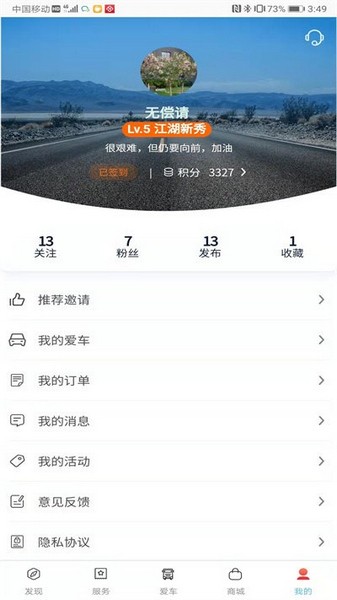 【我的】:查看我的车辆,及商品订单与服务订单,帖子发布记录,消息与收藏内容.个人信息设置与修改。联系在线客服与意见反馈等。