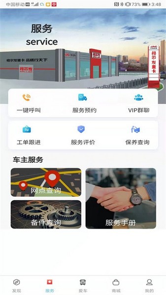 【服务】:为您提供便捷维保服务,您不但可以一键呼救、预约,还可以通过该服务查询周边的网点以及配件的查询,通过养车的手册来了解更多的车辆维保知识。
