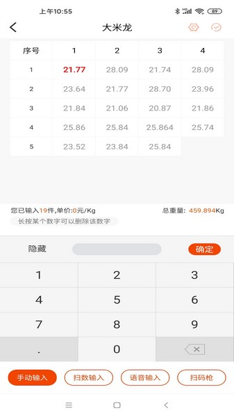 软件有四种抄码方式:手动输入,OCR扫数,语音输入,扫码枪输入。扫码枪输入需要购买扫码枪。语音输入建议您慢慢读出数字,多次使用可以提高识别的准确度。OCR扫数只需镜头对准标签上面的净重数字,按下“扫数”按钮即可,如果您的商品无法扫描数字请联系客服。如果您对我们软件有什么意见或建议,或者发现了使用上的问题可以反馈给客服,客服微信号:saoshu001