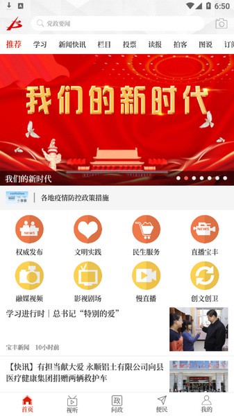 云上宝丰客户端是一款专为宝丰本地人打造的生活资讯软件,整合了当地的新闻资源,涵盖图文、视频等多种形式。首页内容会根据用户的兴趣进行推荐,方便大家快速找到自己喜欢的资讯。除了新闻报道,这个app还提供了不少便民服务,比如政务办理渠道,让用户足不出户就能搞定一些事务。