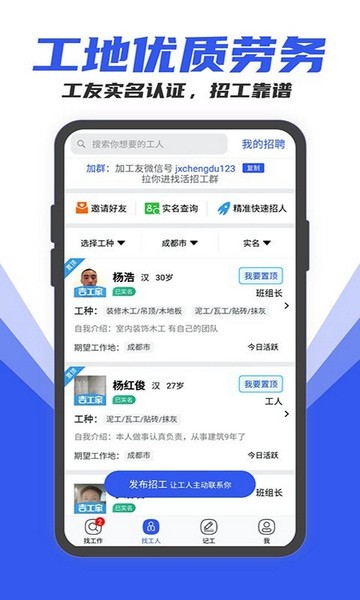 3、每一个工友都是经过实名制的认证的,用户在上面可以找到非常多优质的技术工人