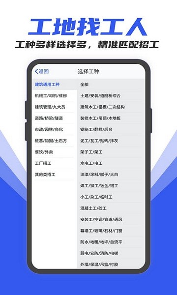 1、工地招工:发布招工信息,工种可以自定义设置,帮助您快速找到工人