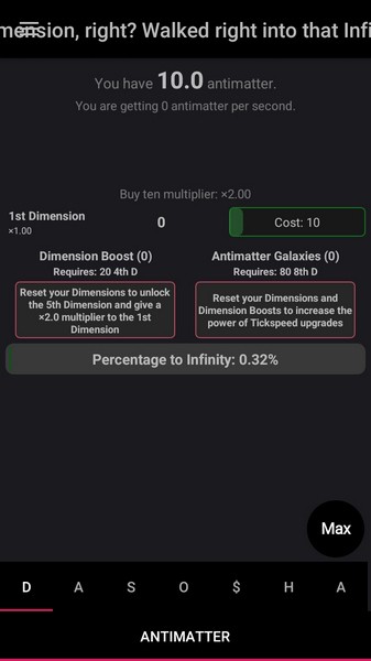 5、有很强的离线进度(所有维度都会继续产生较低的维度,你会获得反物质),然而离线时不会发生购买,所以离线时间通常只是让你到下一个提升/星系,而不是更进一步。
