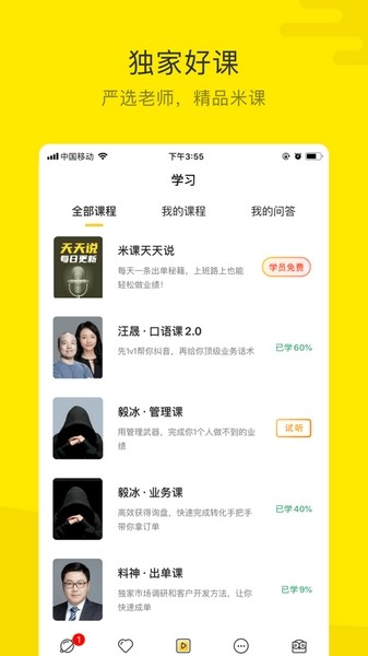 米课圈是一款内容非常丰富的话术学习软件,通过这款软件能够帮助用户快速的学习各个行业的专业话术,并且针对客户的回应还有着详细的讲解,方便用户更快的进行理解,让每一位小伙伴都能够理解外贸行业的前景,掌握更多的专业知识。同时该软件中还有着许多行业大咖在线为大家解答疑惑,满足用户的各种需求,有需要的小伙伴快来下载吧。