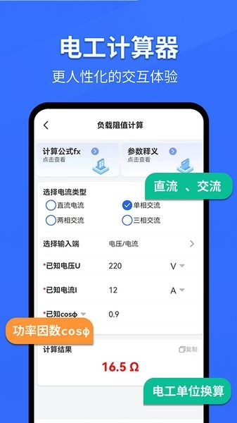 内置了非常实用的电工计算器,可以轻松完成各种复杂的计算任务,比如电阻、功率、电流、电压等的计算。无论你是需要计算负载阻值、阻抗,还是贴片电阻、多色环电阻的识别,它都能帮你快速准确地得出结果。