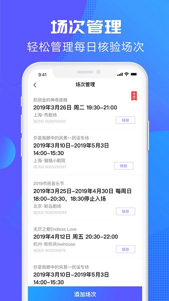 1、进入【场次管理】界面,可根据不同时间安排的场次进行添加或移除专场验票,轻松管理每天的核验场次,