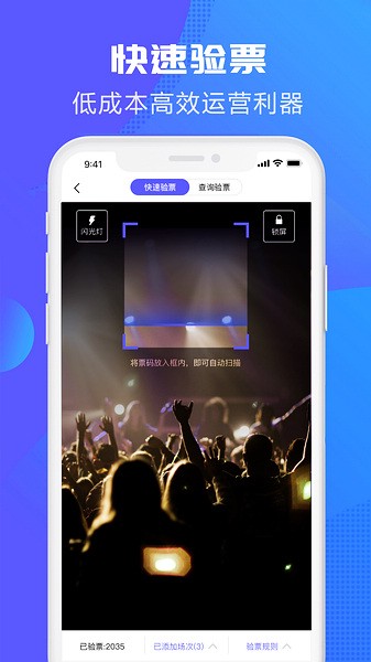 2、进入【快速验票】界面,选择开启闪光灯和锁屏功能,只需将票码放入框中就可以自动扫描验票了,