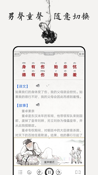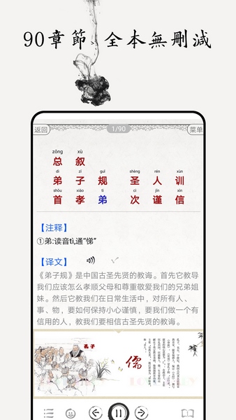 弟子规APP可以帮助用户随时随地学习全本弟子规,若是想要让孩子接受国学启蒙的话,便可以使用这款软件进行学习,其将文字与图片进行结合,图文并茂更加易于学习、理解,并将文中所讲的内容,以励志小故事的形式进行提炼,更加通俗易懂,搭配注释、译文、启示等功能,帮助孩子更好的学习!