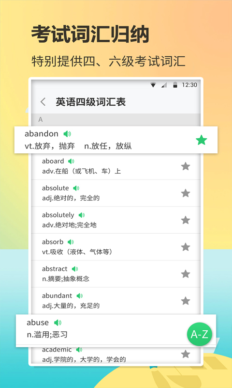 1、自定义添加英语单词到单词本,乱序添加更好记忆,背单词不再每次从Abandon开始。