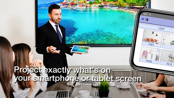4、最多可将 50 台设备连接到投影机、最多可同时显示四个屏幕、将您投影的图像共享给其它连接的设备。