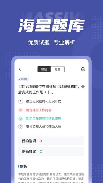 监理工程师考试聚题库是一个针对监理工程师考试的题库,包含了监理工程师考试大纲所确定的范围。监理工程师考试全部真题。更有历年真题及模拟试题题型,题库中的试题全真模拟真实的考试。监理工程师考试聚题库自带搜题功能,监理工程师考试中的疑问一搜便知,更支持语音和拍照搜题。是各位考生学习乃至通过考试的好帮手。
