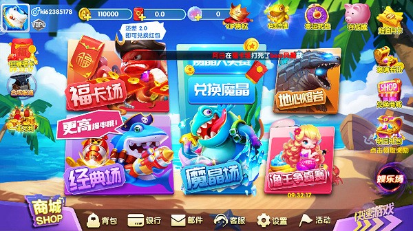 1、游戏主体分为“经典模式”和“机甲狂鲨”二类主要玩法。经典模式包含五种渔场,每个渔场都有不同的玩法和鱼类。