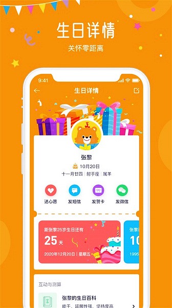 3、生日祝福:幸福的生日送上温馨的祝福,生日时给家人的一条祝福短信、朋友的一条微信、同事的一个生日贺卡,生日小管家都能帮你完成。