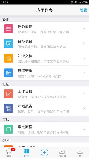 4、项目协作:项目和任务作为云OA中不可少的应用,项目任务分解,相关事项关联系统化的推进,任务管理更好的将执行过程及时有效反馈沟通;