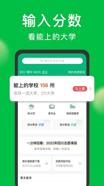能上的学校、录取概率评测、志愿风险评估、按分数选学校、按分数选专业、专业数据对比等超级实用功能,助你快速锁定大学和专业