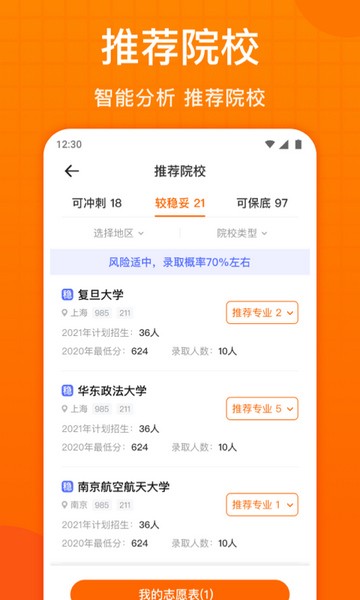 高考志愿榜结合学生分数推荐冲刺、稳妥,保底等不同梯度院校,分析高校历年录取,提供各校优势学科、历年招生数据、高校硕博点等情况。