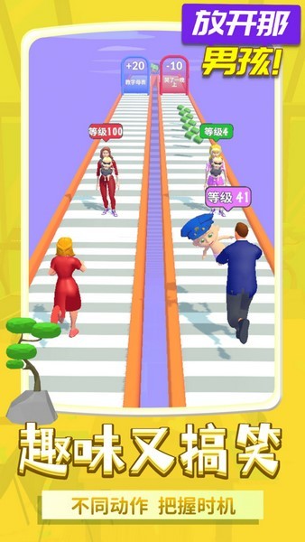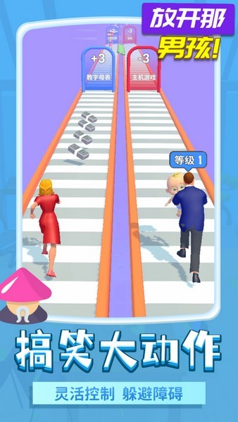 放开那男孩是一款跑酷装扮类游戏,为玩家准备了大量的关卡,同时融入了搞笑的元素。在初期将会由一对父母带着孩子跑酷,来父母之间来回传递孩子,使其捡到路中间的钞票。而随着游玩孩子会长大,然后就可以自己行动了。此外完成关卡之后还可以获得各种家具,可以用来摆放在房间中,想怎么搭配怎么摆都是非常自由的。