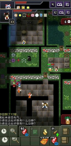 2、在像素地牢中使用酷似博丽灵梦、小兔姬、藤原妹红的角色们冒险。