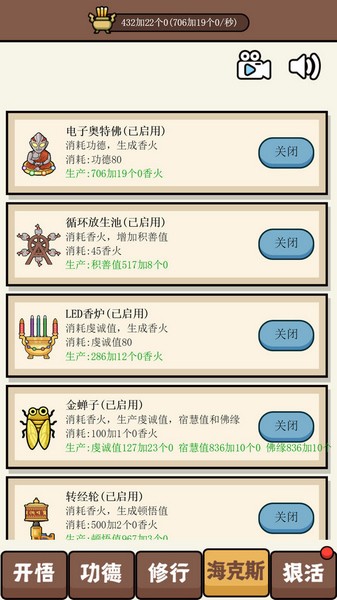 5、功德提升后我们就可以点击修行,在这里购买提升修行效率的道具,如筋膜枪、电子佛、功德等等