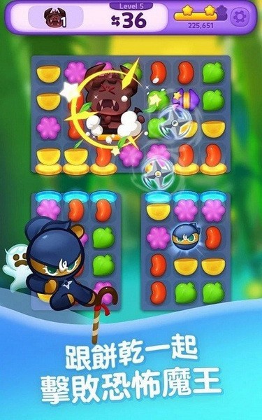 饼干道具:所需果冻65,消除浅蓝色7格;开始冲浪并消除附近7个浅蓝色果冻