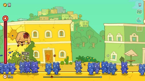 野牛复仇记中文版和我们经常接触的横版闯关游戏相仿,但是没有一个固定的操控方式,只要把我们的野牛先生使劲丢出来,之后的事情就是命运由天定,我们的手指只能起到辅助的作用。野牛小子在弹飞出来之后,会砸向地面的糖人,砸到糖人会继续弹起来,但是砸到地面就会削弱弹性,所以尽可能的要砸到糖人,让自己飞的更远。总之有点像愤怒的小鸟和天天酷跑的结合体。