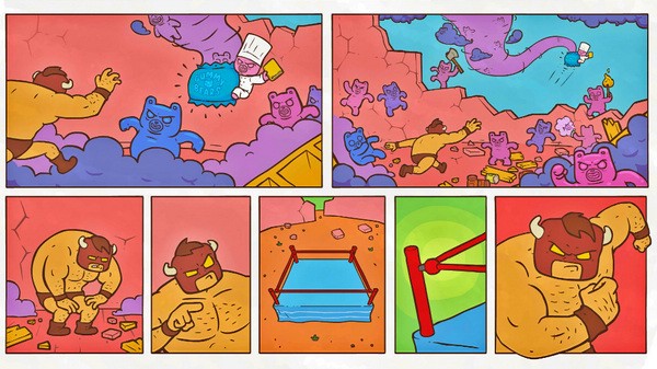 游戏讲诉了野牛小子为了购买日常生活用品就去了一间超市,之后无意间经过糖果食品区的时候发现一包名为糖果世界的蓝色袋子突然伸出了一只手把野牛小子拉进了包装袋里。然后等野牛小子清醒过来后,发现自己被关在一个擂台上的牢笼里,而外面则有一群色彩丰富的小熊人举着不同的牌匾抗议野牛小子。最后,我们的野牛小子被这种莫名其妙的事情搞到愤怒了,接下来就是野牛小子的复仇之路,并且冲出糖果世界,回到超市。