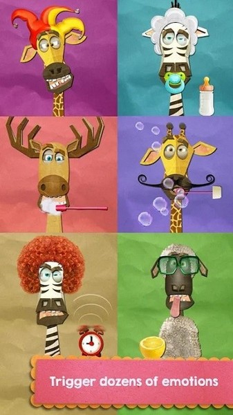 这些动物具有很强的个性,能在不同的情景中表达不同的情绪。它们听到号角或警报声时会跳起来。它们悲伤时耳朵扁平并且平耷拉下来。让它们的眼睛转动,可听到它们高兴地咯咯笑。当孩子们将长颈鹿变成迪斯科舞星,在墨西哥嘉年华上和斑马嬉戏,让绵羊住在自己的城堡或看着麋鹿潜入水中时,您会看到孩子们高兴地边笑边跳,千万不要惊讶哦。本应用程序可谓寓教于乐。