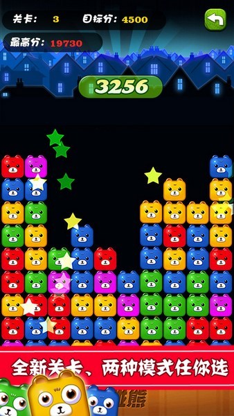 操作简单便捷:游戏拥有简单方便的用户操作界面,玩家只需单指操作,将两个及以上的同色熊熊排列在一起即可消除。