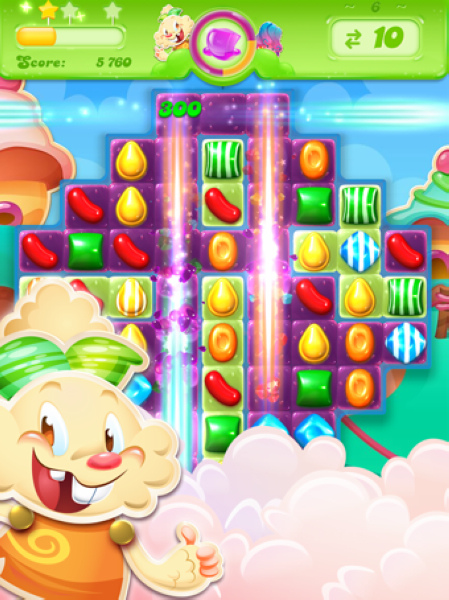 三种特殊糖果:斑纹糖果、包装糖果、彩色糖果。直行的糖果可以消灭糖果所在位置那一整行,横条纹的糖果可以消灭那一整列。包装糖果则是会消灭以这颗糖果为中心周围九宫格的糖果,效果有2次。彩色糖果只要2颗即可发挥作用,当彩色糖果与旁边的糖果交换位置时,会消灭场上所有该颜色的糖果。彩色糖果和条纹、包装糖果交换:场上所有该颜色糖果都会变成特殊糖果。假设彩色糖果跟绿色条纹糖果交换,那场上所有绿色糖果都会变成条纹糖果,并且引发条纹糖果的功能。所以在开局,尽可能的制造比较多的特殊糖果,选择一个合适的时机消除特殊糖果,是打开局面的一个很好的方式。