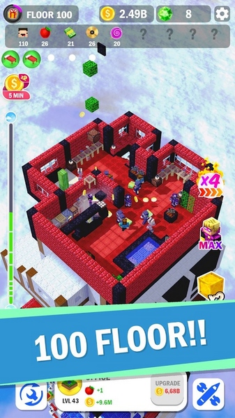 2、楼层会自动建造,长按住屏幕可以增加建造速度,提高楼层高度,赚取更多金币。