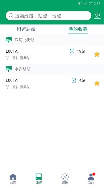 3、进入出行页面,可以浏览附近的站点信息,并查看我的收藏记录