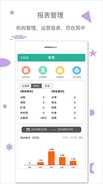 1、适用于单个校区学员达30人以上规模,美术、舞蹈、乐器、跆拳道、国学等各种素质兴趣培训机构的核心管理环节的永久免费移动管理工具。