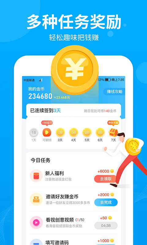- 拥有丰富的趣味任务,用户通过完成各种各样的任务来赚钱,步数红包,邀请红包都可以有;