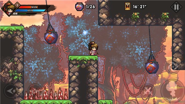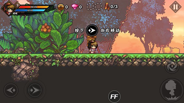 2、左下角的左右按键可以控制角色前后移动,右下角为跳跃和发射飞镖,注意在跳跃的时候我们控制跳跃的点击的时间越久跳跃的高度就是越高的。