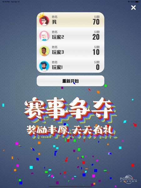 2、排名顺序:游戏结束后,输了的三人按照分数进行排名。若分数相同情况下,看手中剩余牌的张数多少。