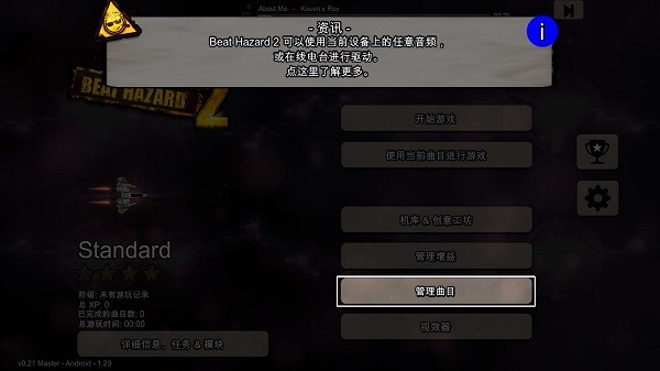 在游戏主界面中点击“管理曲目”,便可以使用当前设备上的任意音频,或在线电台进行驱动。