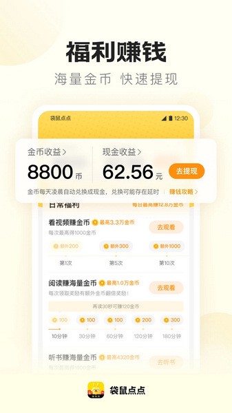 1、刷视频、看好剧,省流量,赚现金,尽在袋鼠点点