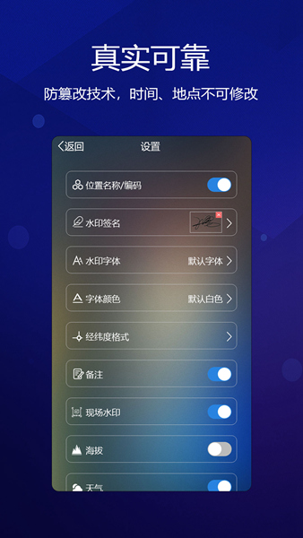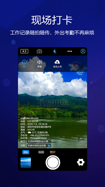 现场水印:经纬度、地点、时间、海拔、天气、位置名称编码、个人签名、手机号、IMEI等水印;